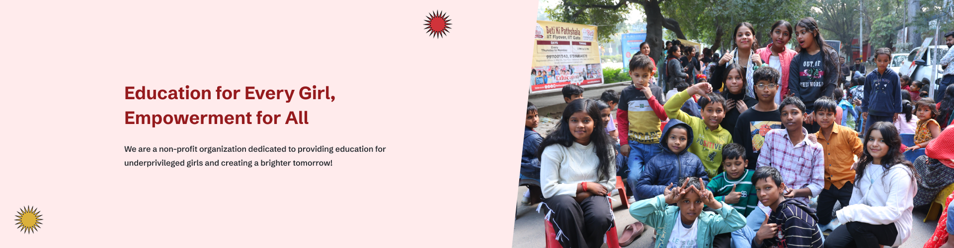 Providing free education to street children. Street children are those who depend on the street to live or work and are either on their own or live with other children or family members. They have no form of legal identity and cannot access social benefits by the government like free and compulsory education, health, etc. Some of them live underneath bridges and inside large godowns, they eat when cooked food is distributed, and some collect discarded vegetables from markets to cook and eat. It is difficult to determine the origin of the child. The child might have been trafficked or stolen from somewhere else and might not know that the people claiming to be his parents are his traffickers.