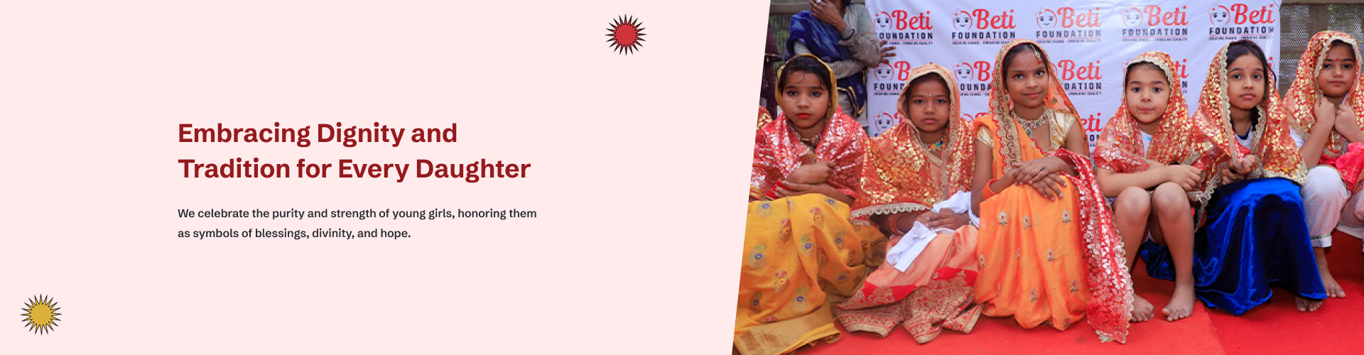 Kanyapujan is a ritual during Navratri in which 9 young girls between 2-10 years are worshipped and are given food and gifts. The idea behind Kanya Pujan is to motivate people the education of girl children and help them to get a better life. One of the Unique and Grand events is organized by Beti Foundation, Delhi based establish organization working for underprivileged Girls and Women in an esteem organization working to support development at the grassroots and improve the quality of life of underprivileged communities across rural India. The event will be held during Navratri every year.